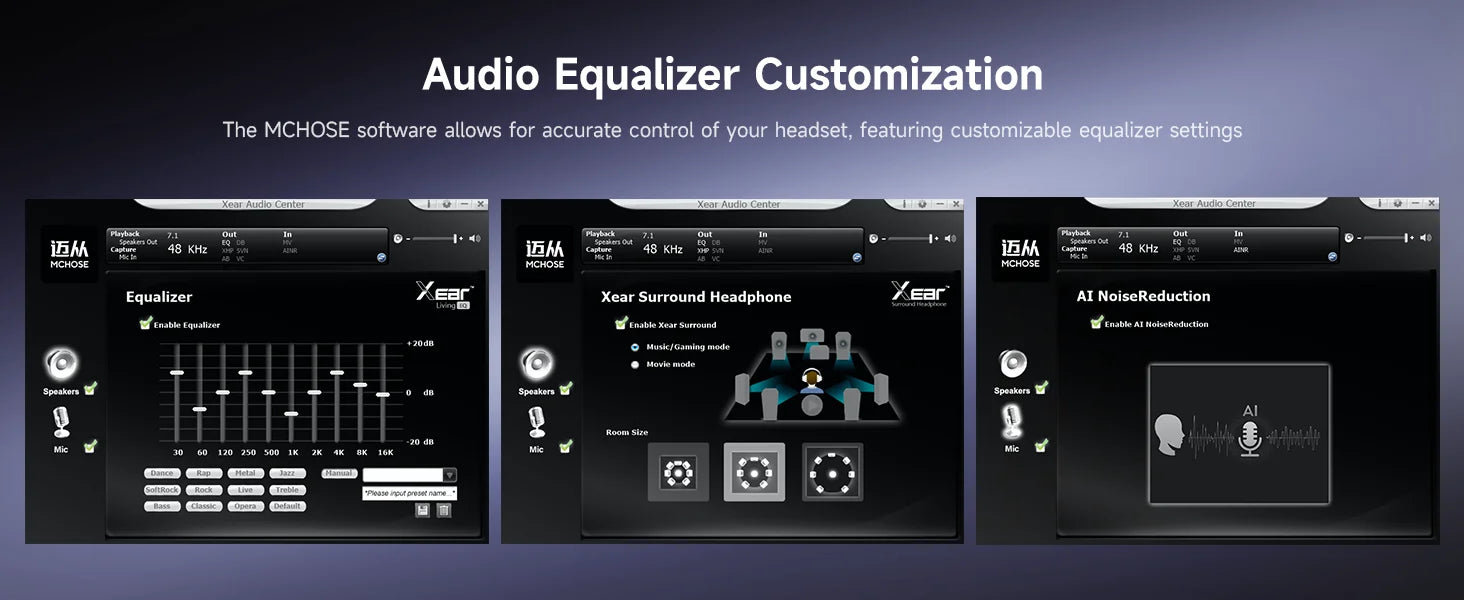 The MCHOSE software allows for accurate control of your headset, featuring customizable equalizer settings. Customize your audio to easily distinguish key sounds and improve your reaction time and positional awareness in the heat of the game.